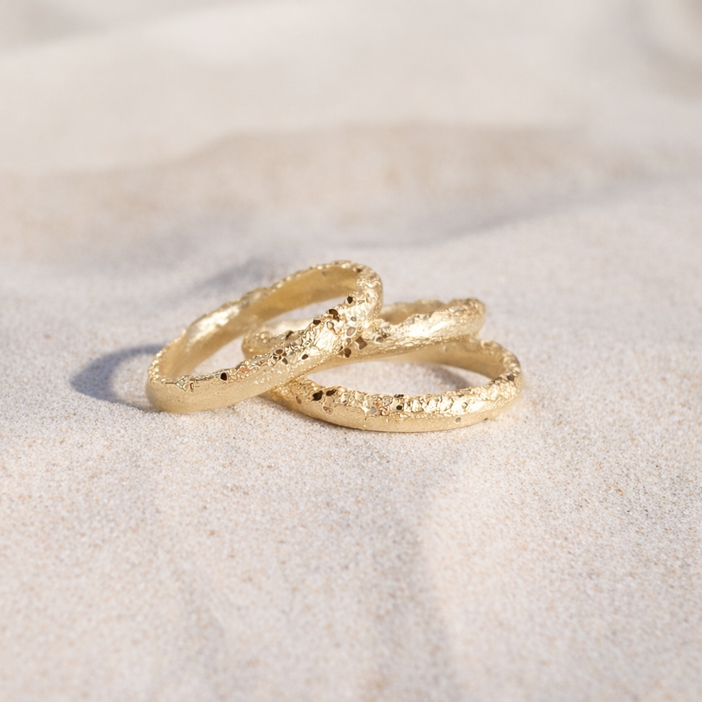 Handmade in recycled precious metals, The Océane Ring captures the raw beauty of the shoreline. Each piece is created using the ancient art of sand casting, where molten metal is poured directly into sand, leaving behind organic textures that echo the rhythm of the sea.