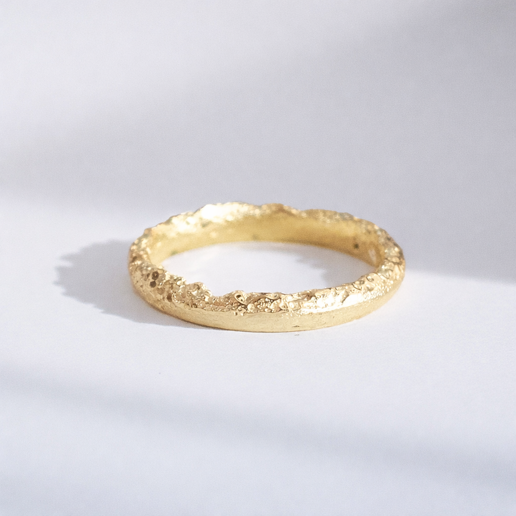 Handmade in recycled yellow gold, The Océane Ring captures the raw beauty of the shoreline. Each piece is created using the ancient art of sand casting, where molten gold is poured directly into sand, leaving behind organic textures that echo the rhythm of the sea.