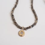 Brown rough diamond beads on a choker style necklace, featuring 9k yellow gold bubble charm with white stone cast in place.
