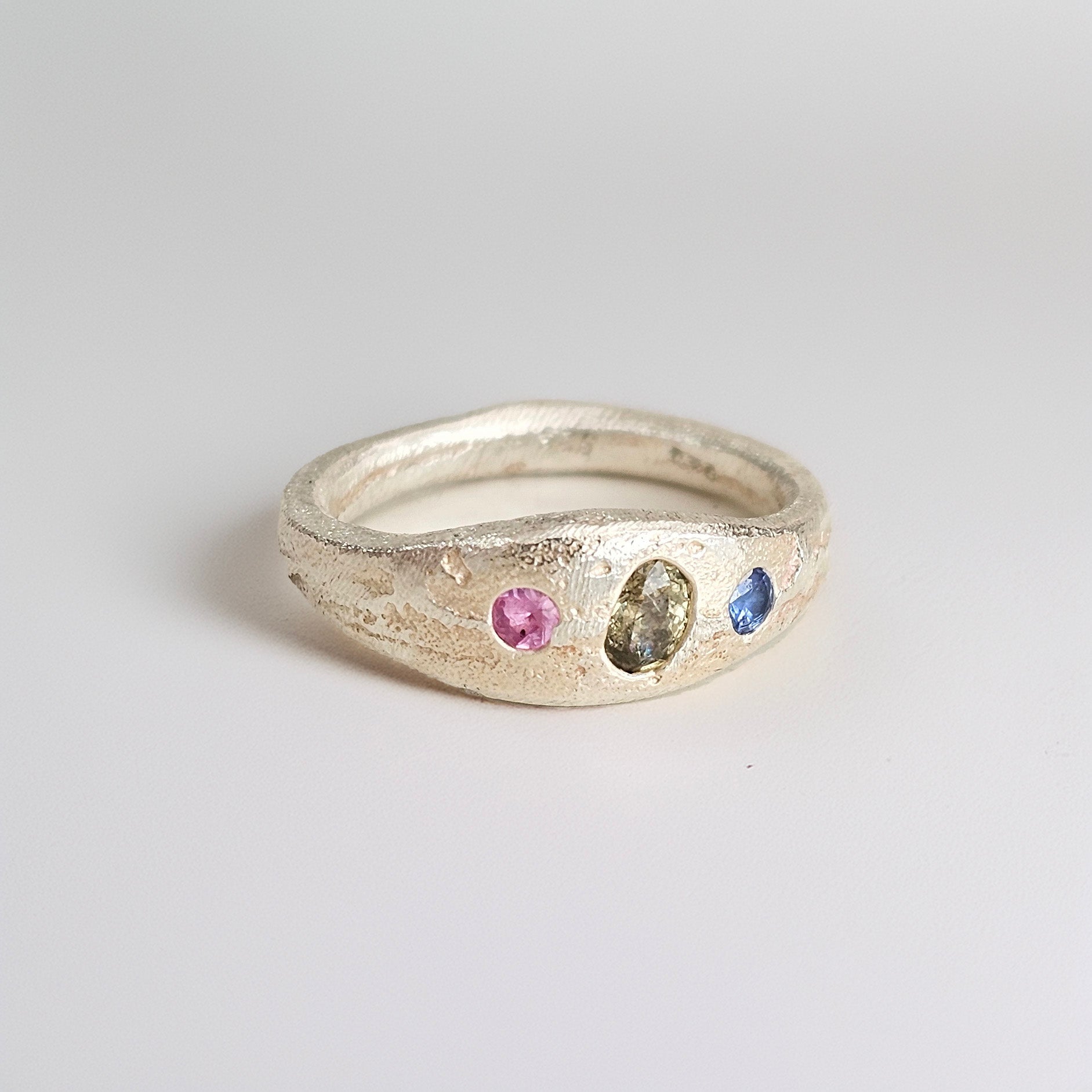 Based on the best selling Aluna Ring design, this larger version is sandcast in recycled silver and features 1 yellow oval sapphire, 1 blue & 1 pink round sapphires. Handmade and one-of-a-kind, this Aluna Bold ring in stock and ready to ship.