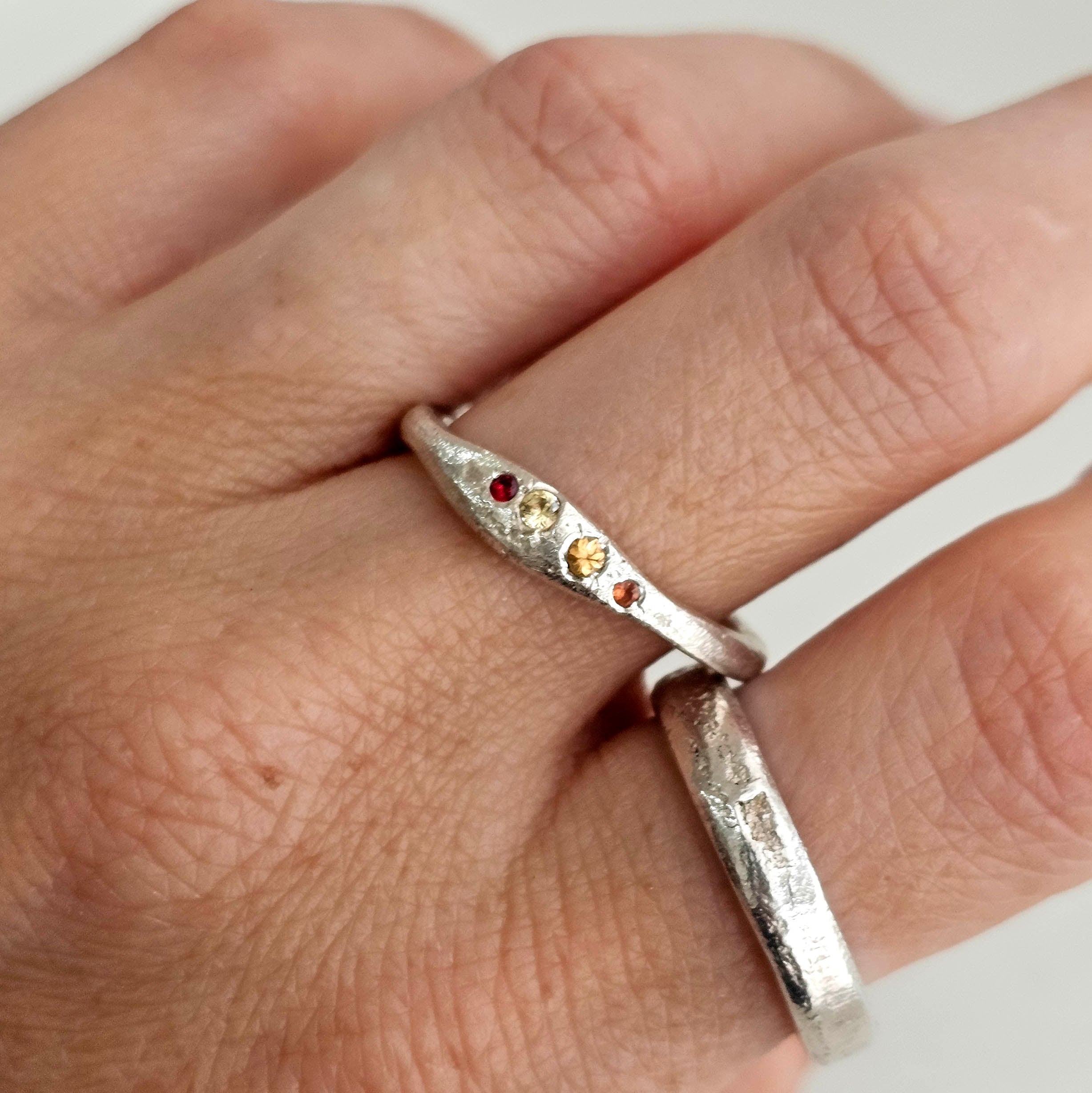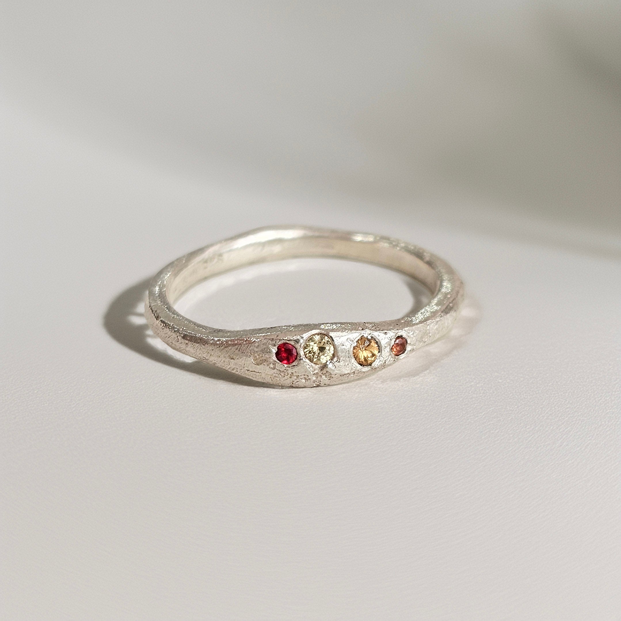 Silver Aluna ring, size T.5. Features yellow, red & orange sapphire stones, cast in place.
