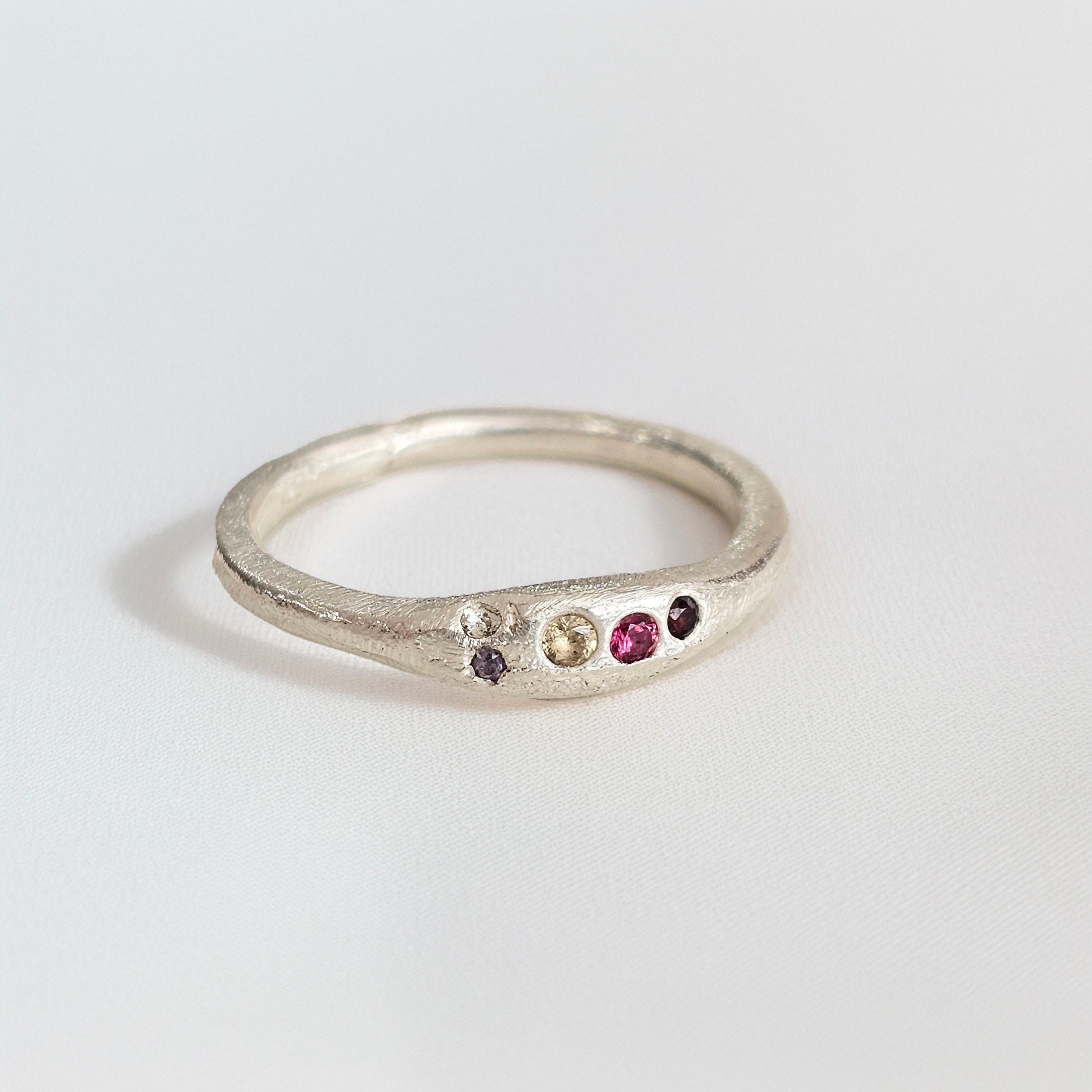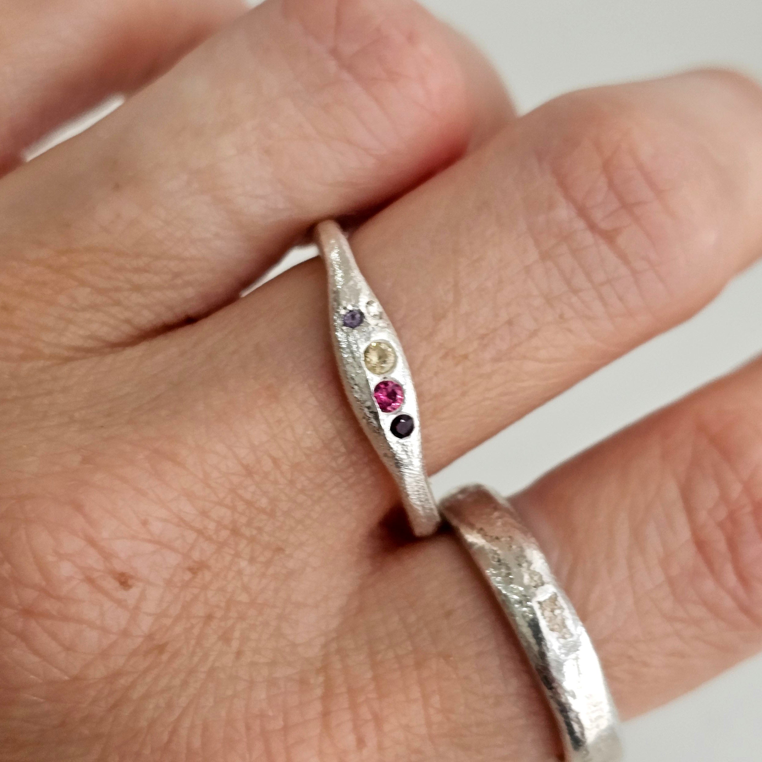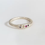 Silver Aluna ring, size R. Features dark blue, yellow, red & lavender sapphire stones, cast in place.