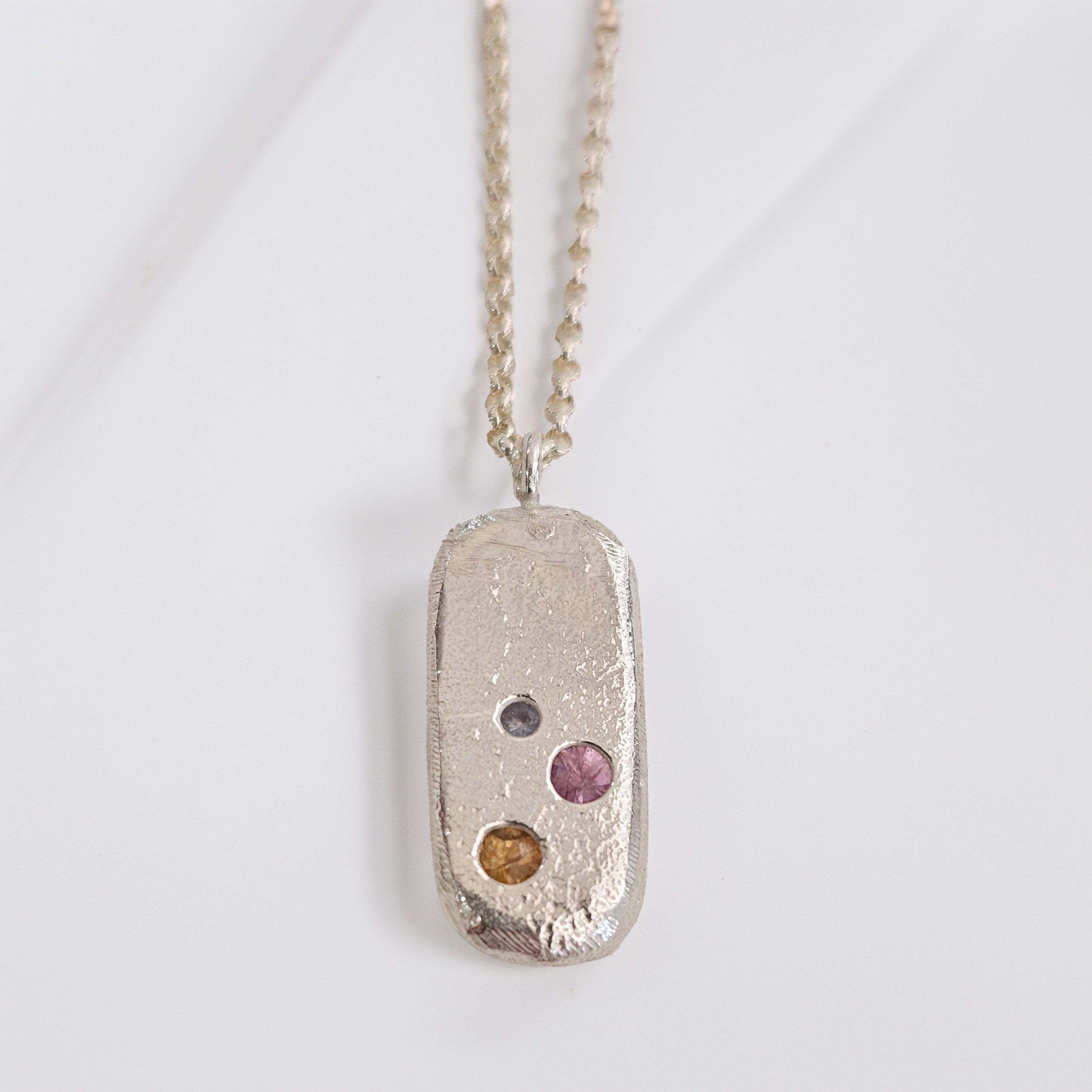 A larger version of our Small Tablet Necklace, this pendant has been handcrafted with recycled silver and contains three mixed coloured sapphire stones, yellow, pink and green.