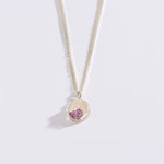 This pendant has been handcrafted with recycled silver and contains approx. 0.20 total of pear shape pink sapphire stone. The pendant measures 1cm in diameter and the chain length is 16-18".