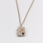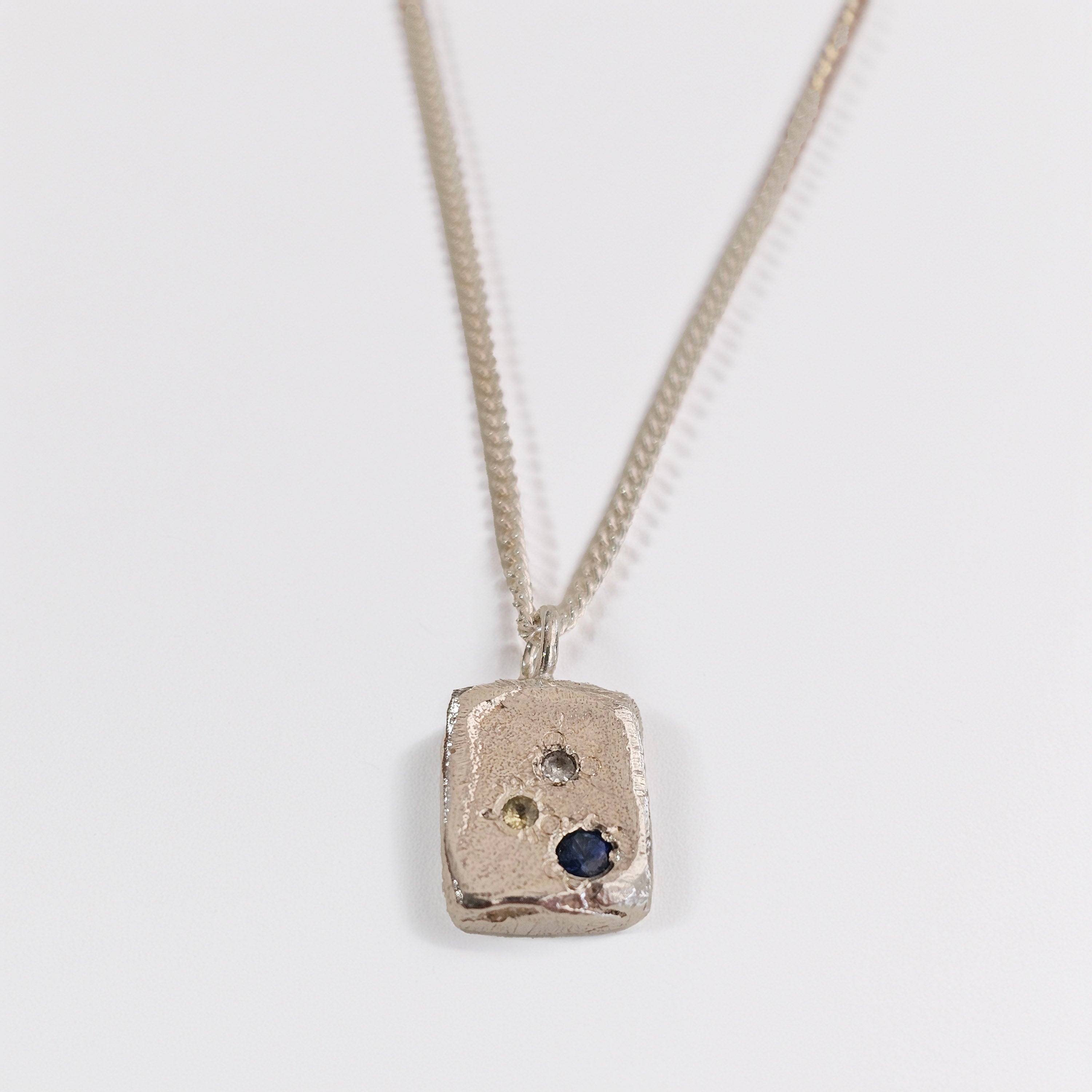 Recycled silver and mixed sapphire square tablet necklace, ethical jewellery handmade in Sydney.