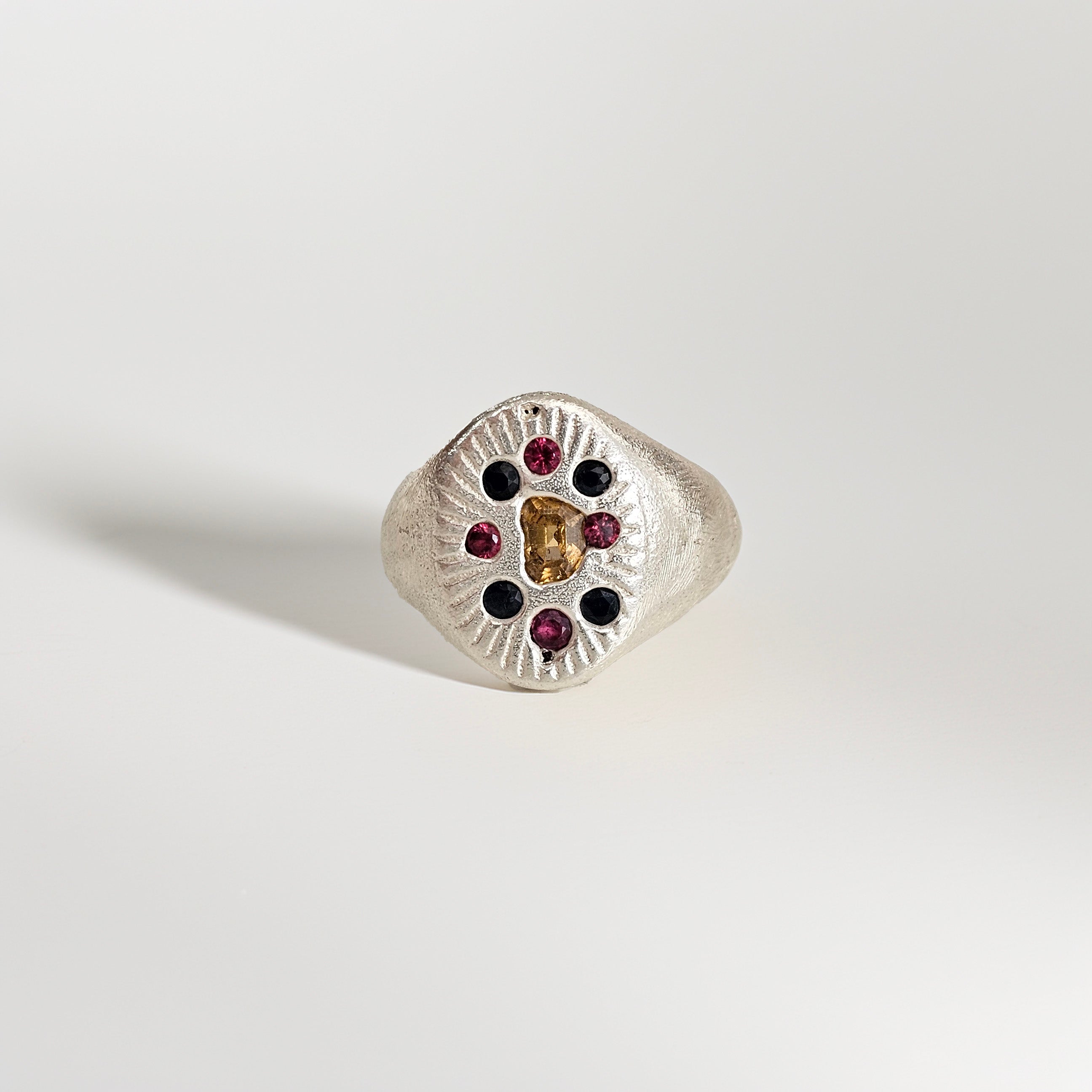 Starburst ring - one of a kind. Sterling silver and yellow sapphire centre stone with blue and pink sapphire halo, cast in place.
