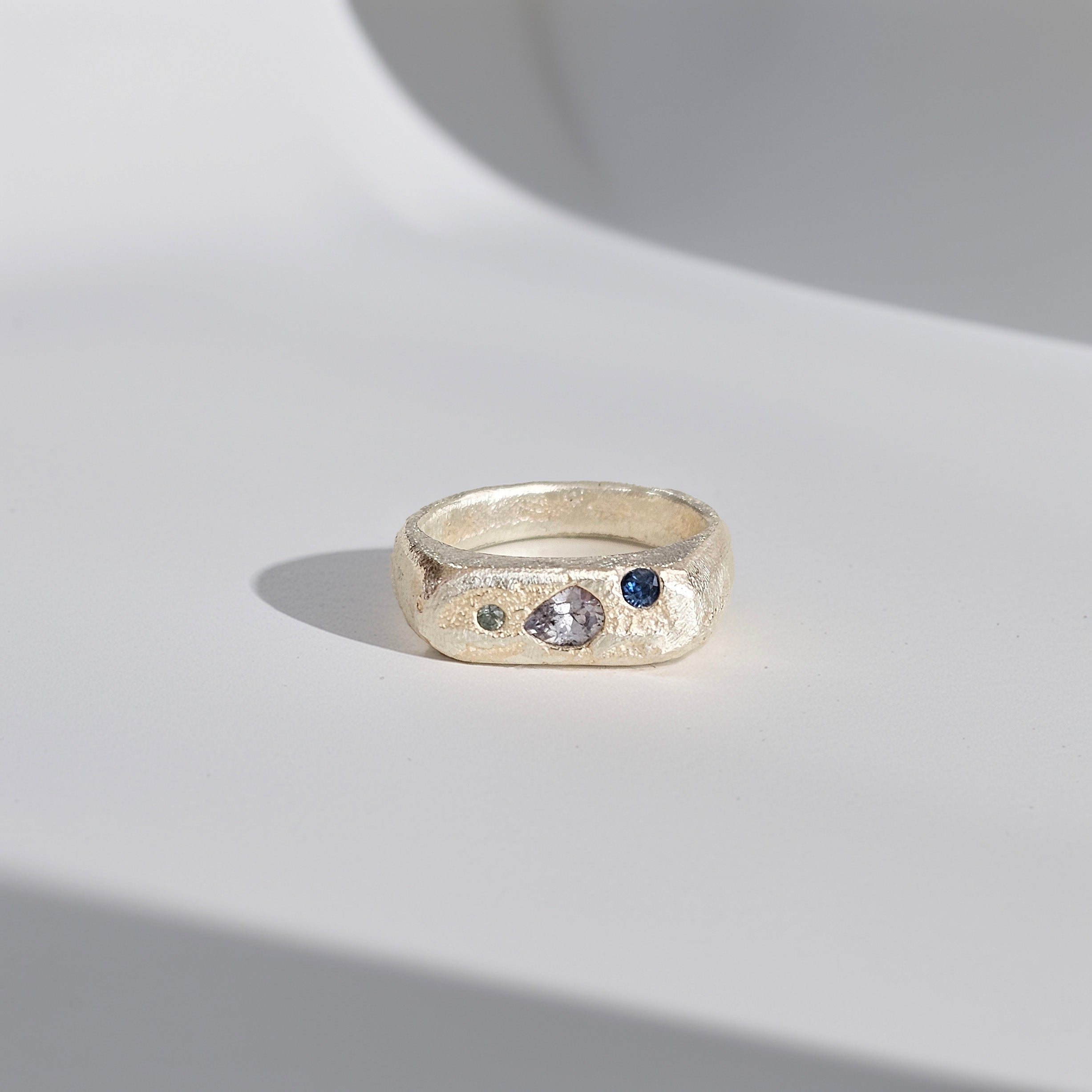 Silver Tablet signet ring with 1 light blue pearl sapphire, 1 light green & 1 dark blue round sapphire stones.