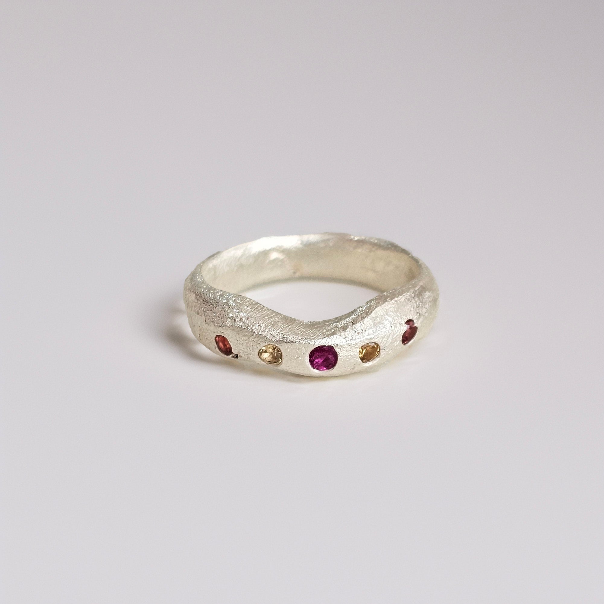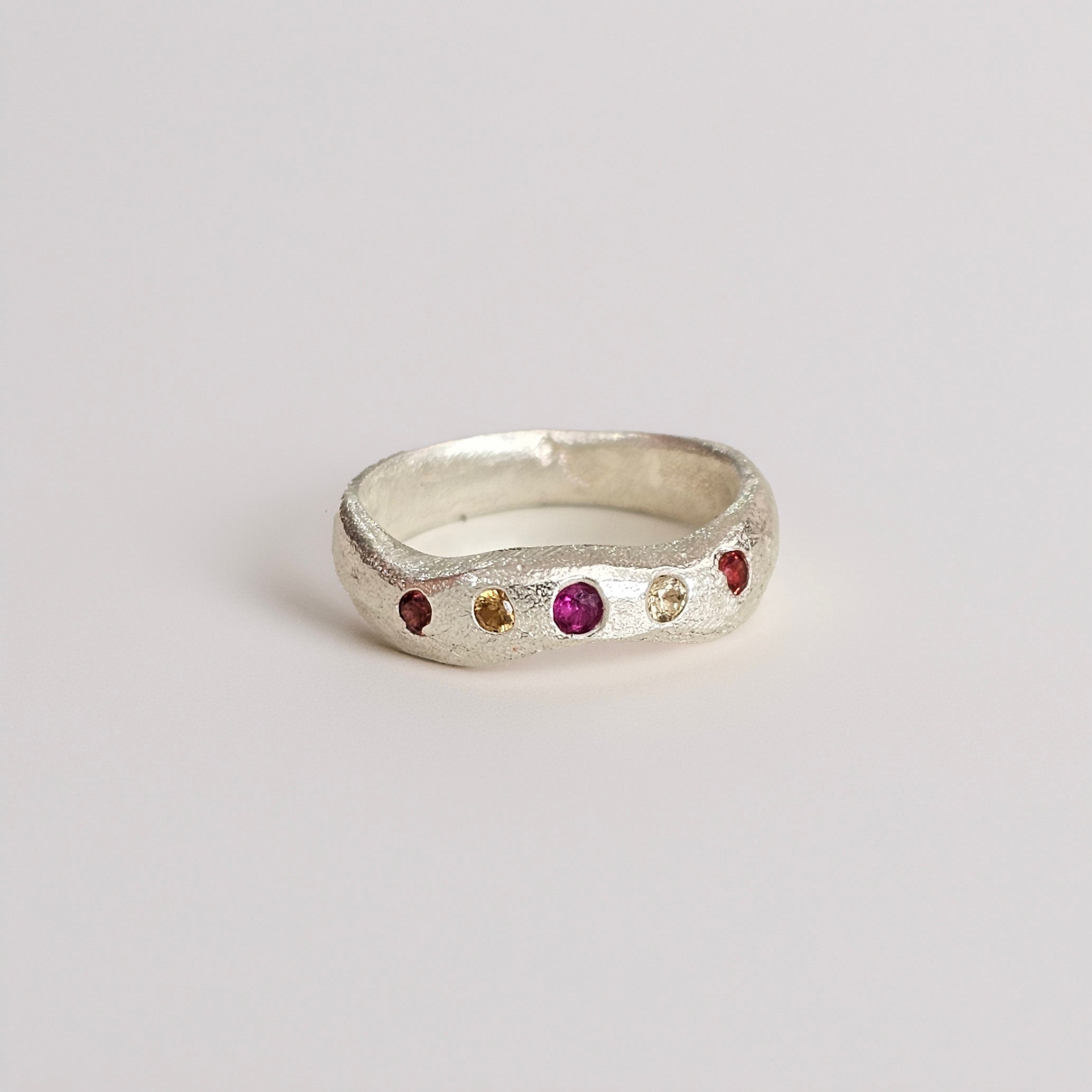 Handcrafted in our Sydney Studio on Dharawal Country, from recycled silver and responsibly sourced gemstones, the metal used in this ring is melted down and hand poured into a mould so that the stones are cast into place, not set. This process of sand casting, or Delft clay casting results in one-of-a-kind fine jewellery pieces. Due to the nature of this process, the stone colour, placement, texture and finish of each piece will be unique. That’s the beauty of buying made to order, handmade jewellery!