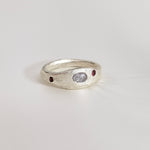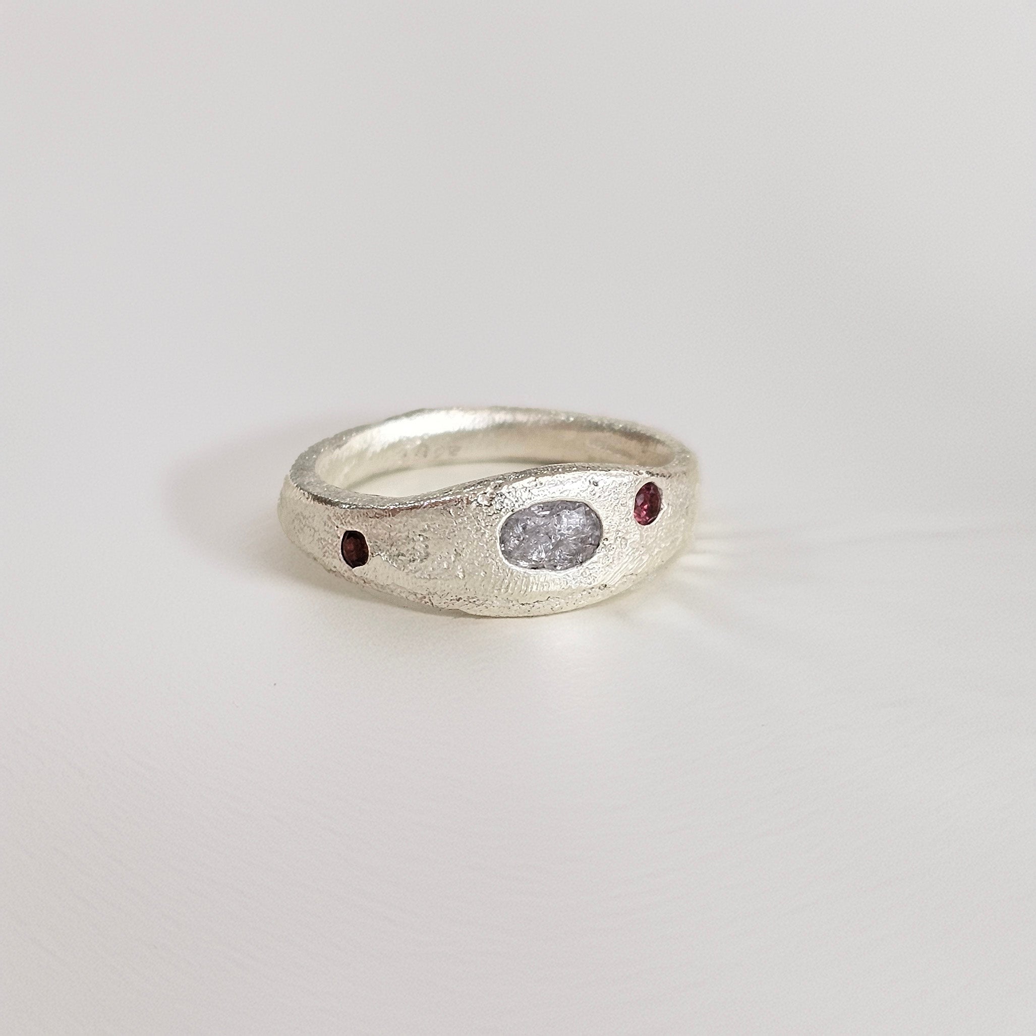 Based on the best selling Aluna Ring design, this larger version is sandcast in recycled silver and features 1 blue oval sapphire & 2 red. Handmade and one-of-a-kind, this Aluna Bold ring in stock and ready to ship.
